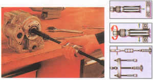 操作說(shuō)明: 從軸承孔中插進(jìn)拉拔器旋轉(zhuǎn)后部六角螺絲使拉拔器脹大 裝上附件:滑塊沖擊錘 桿式絲桿拉拔器(僅包含在40-2中)